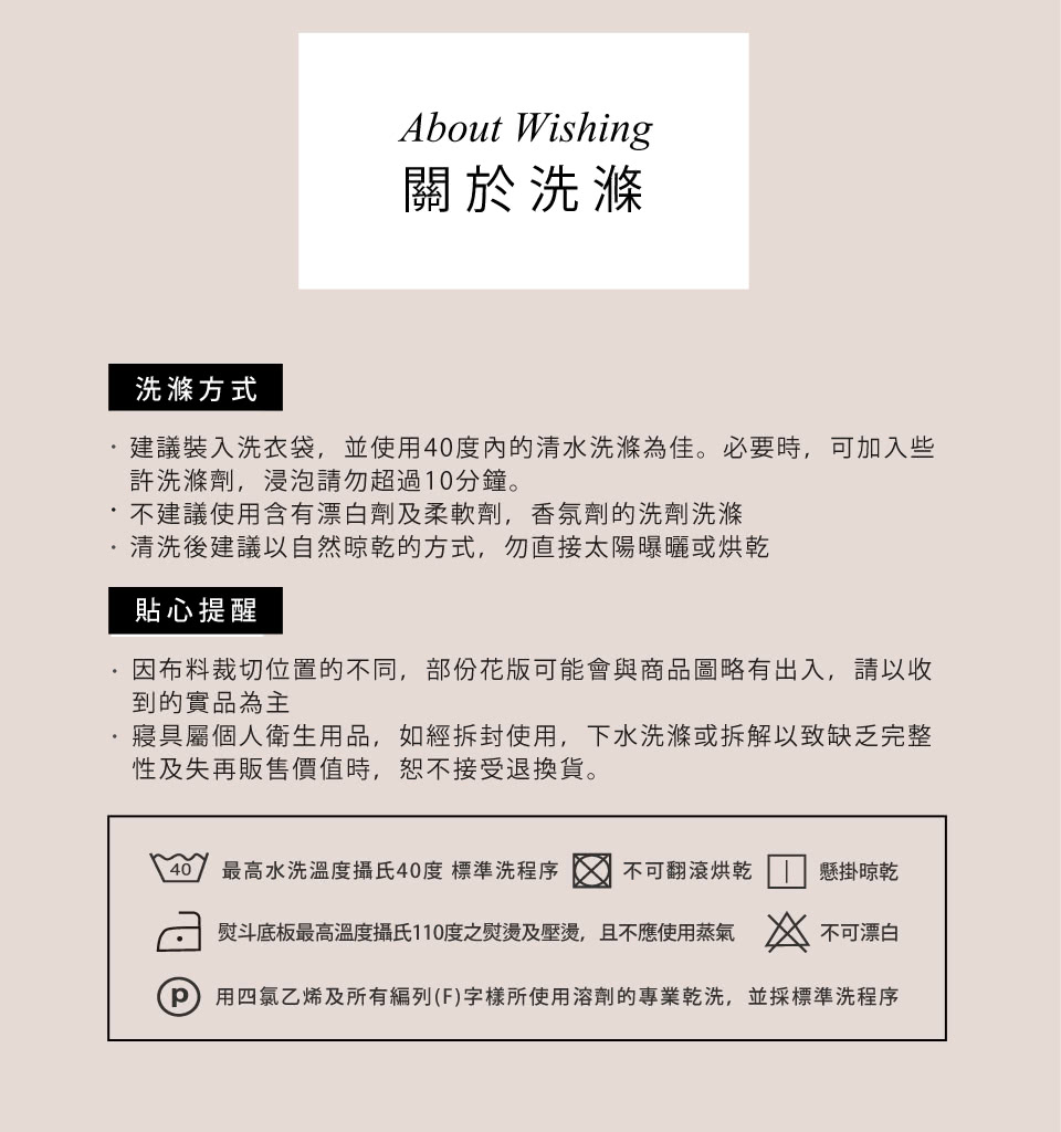 ◎清潔保養方式:可水洗(水溫不超過攝氏40度)∕可乾洗∕不可烘乾∕低溫熨燙(溫度不超過110度)∕不可漂白
